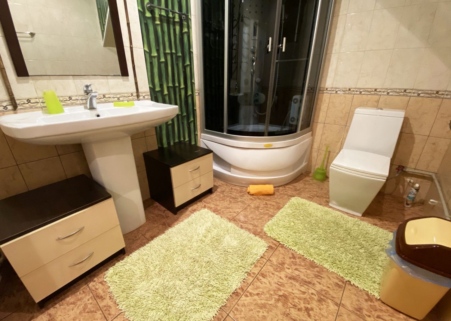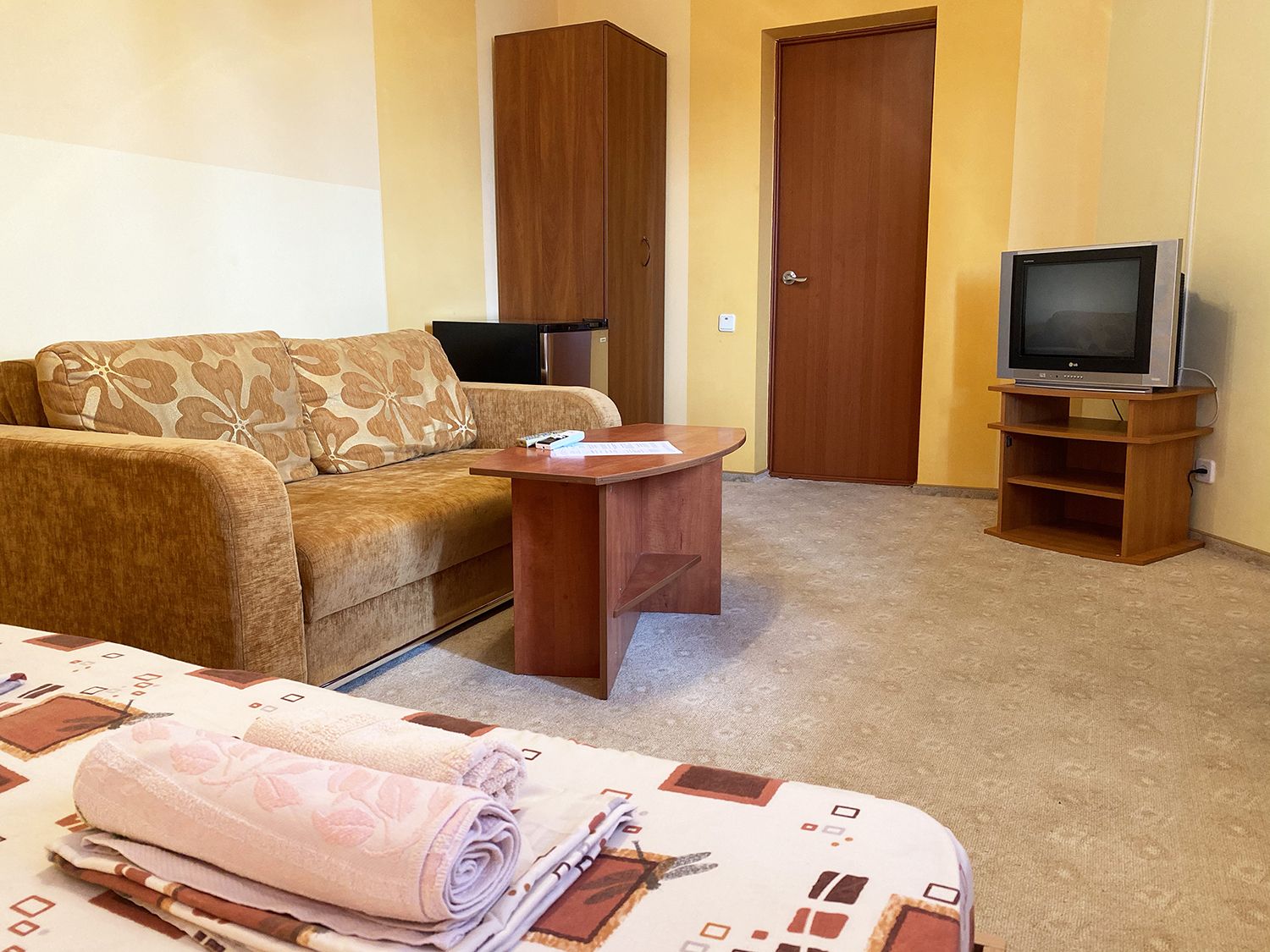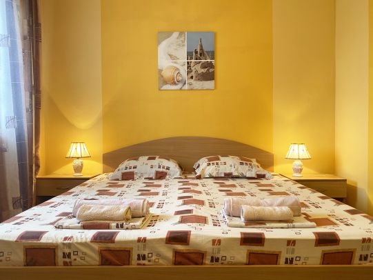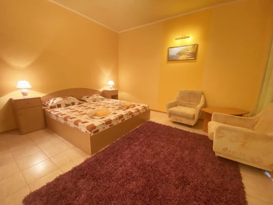 4-х 5- местные номера «Люкс» Номер студио, состоит из двух зон, не разделенных дверью (спальная и гостевая). В номере необходимая мебель, двуспальная кровать, двуспальный диван, кондиционер, телевизор, Wi-Fi, холодильник, сейф. Санузел в номере.