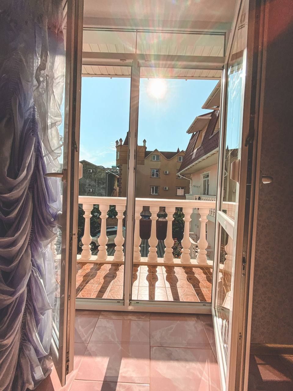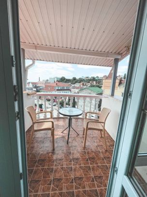 2-х местный стандарт с большим балконом: В номере санузел, двуспальная кровать, необходимая мебель, холодильник, телевизор, интернет, кондиционер, балкон, столик и стулья.